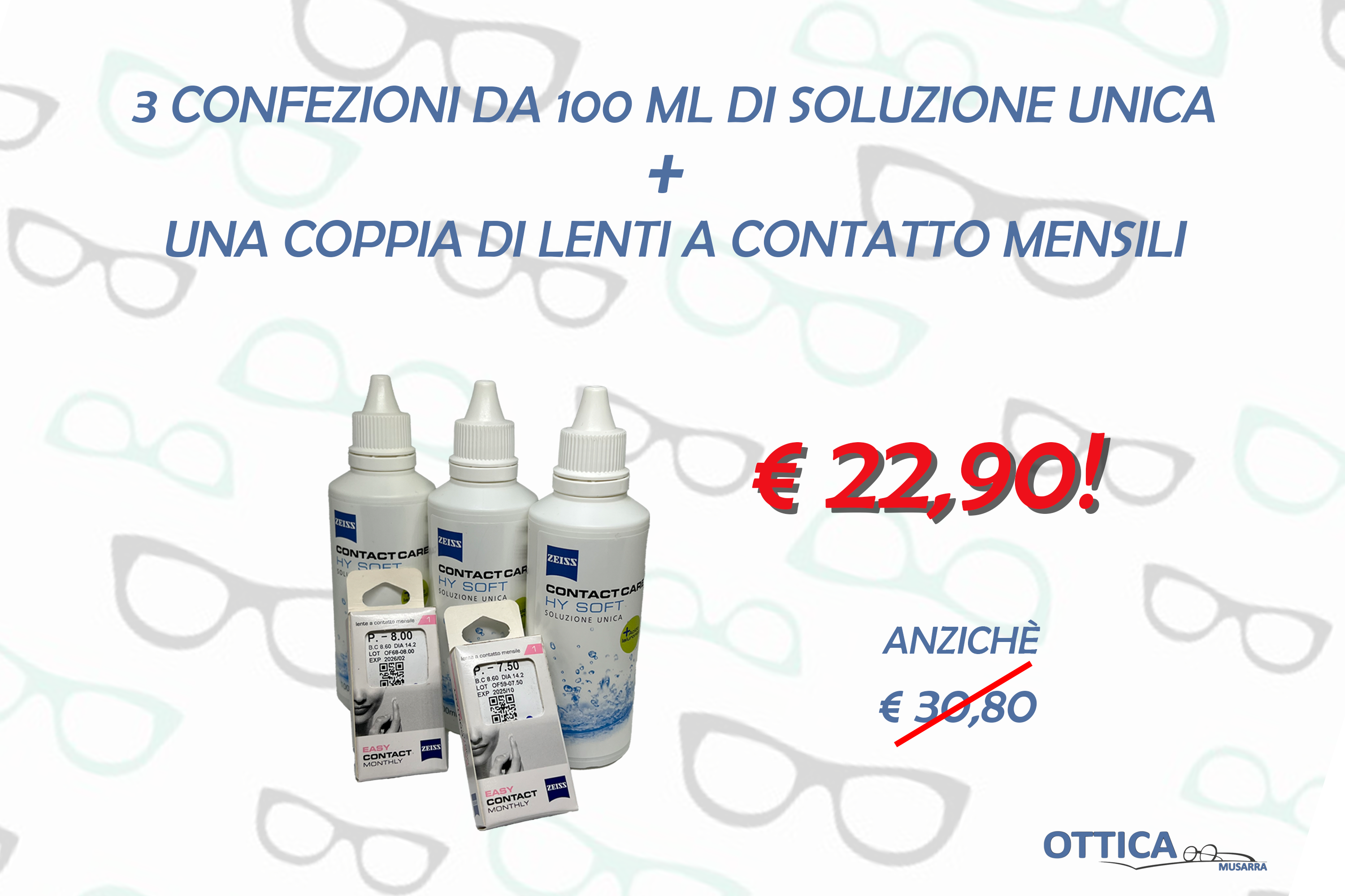 3 confezioni da 100ml di soluzione unica + una coppia di lenti a contatto mensili a €22,90 anziché 30,80€.